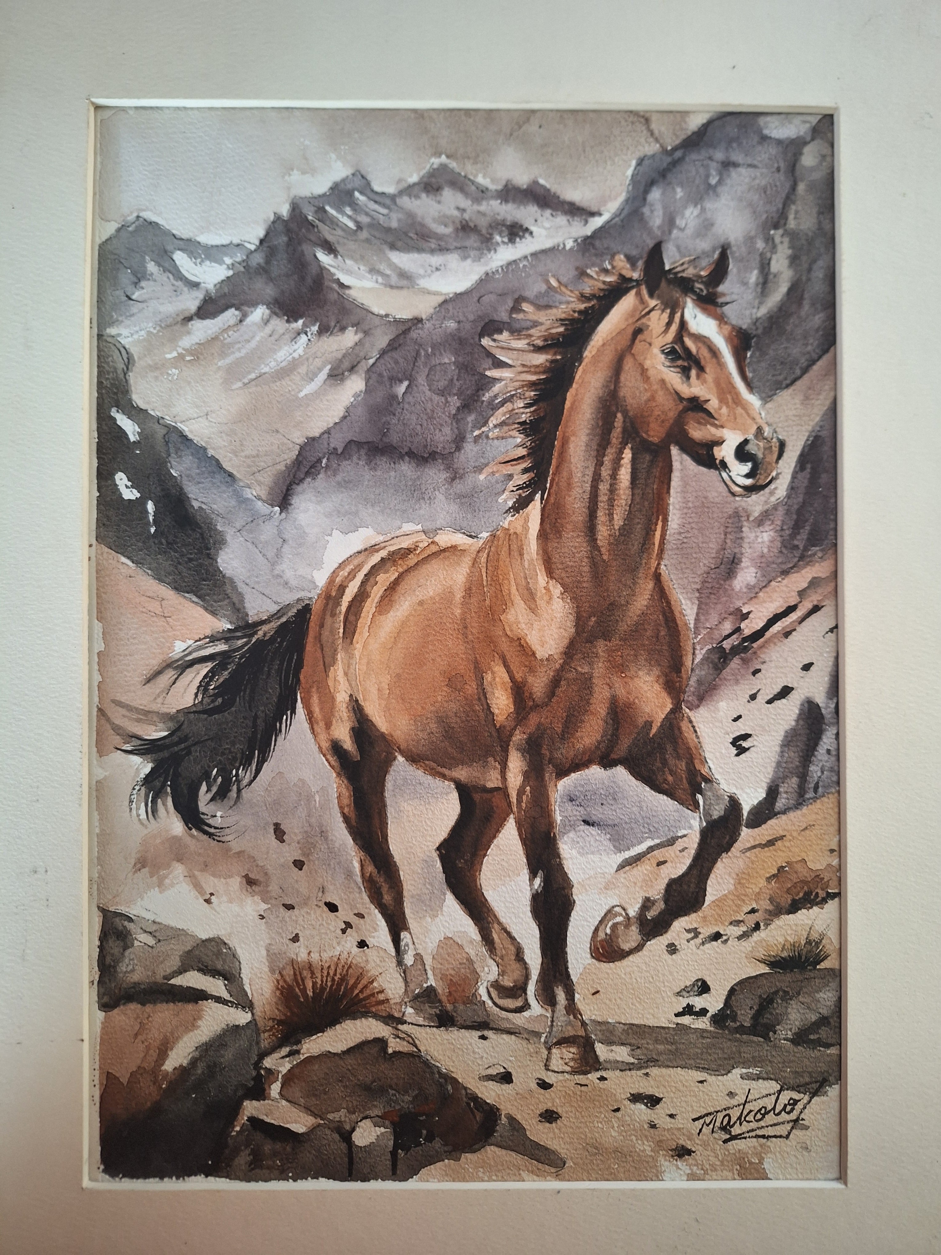 険しい山岳の合間を駈け登る馬の姿を描きました。
