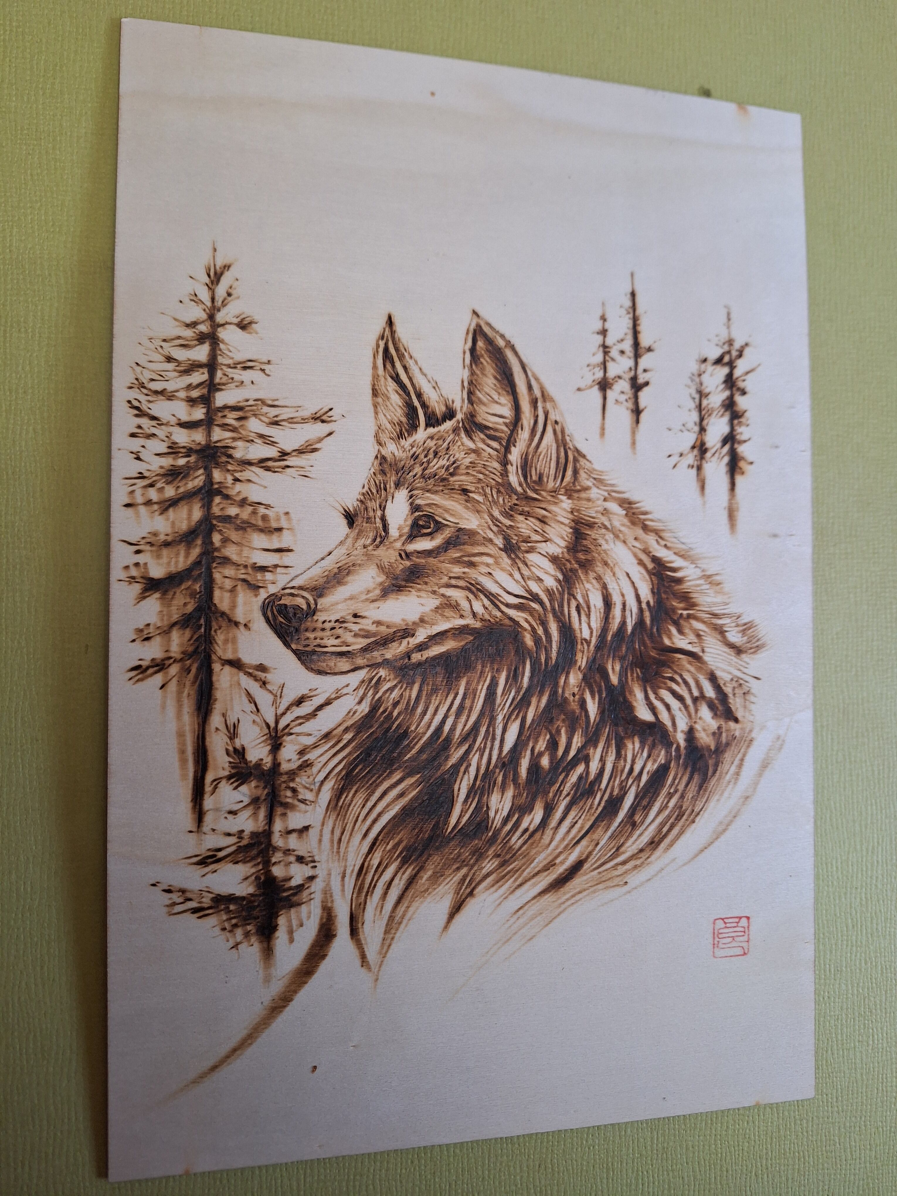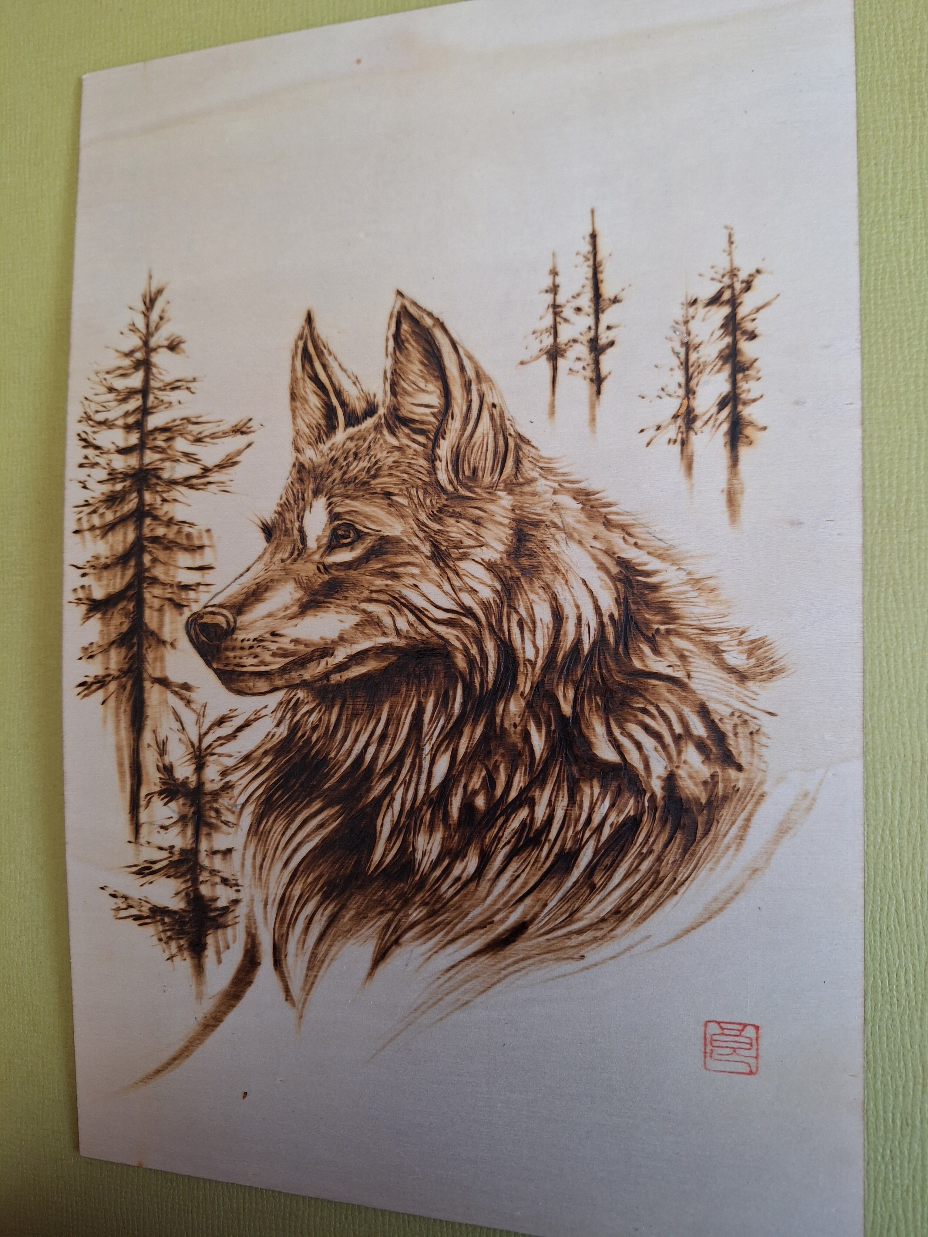 ウッドバーニングは電熱ペンや電気こてやバーナー等で板やコルクや革製品に焼き絵アートとして描く技法です。