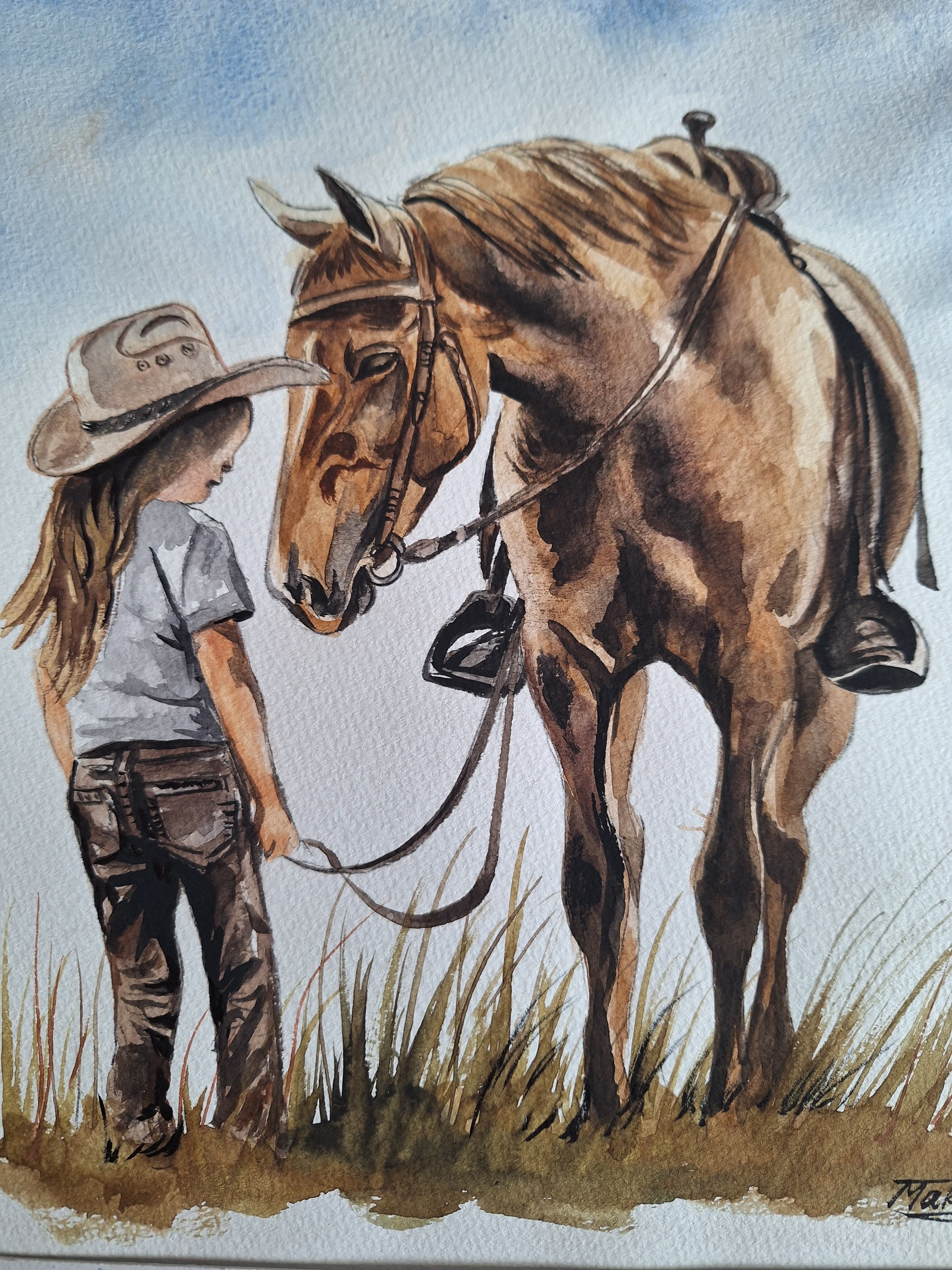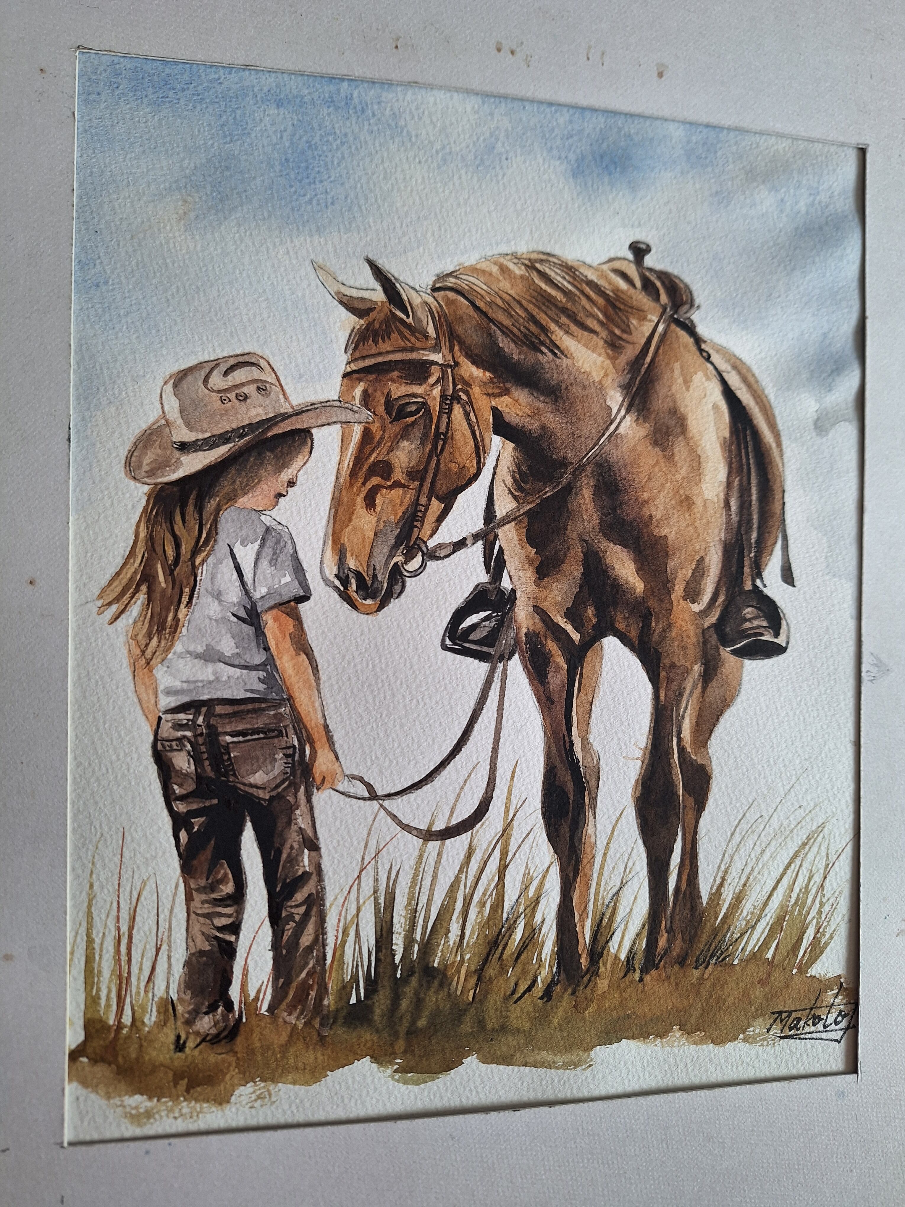 晴天下、愛馬と散歩する少女の姿を描きました。