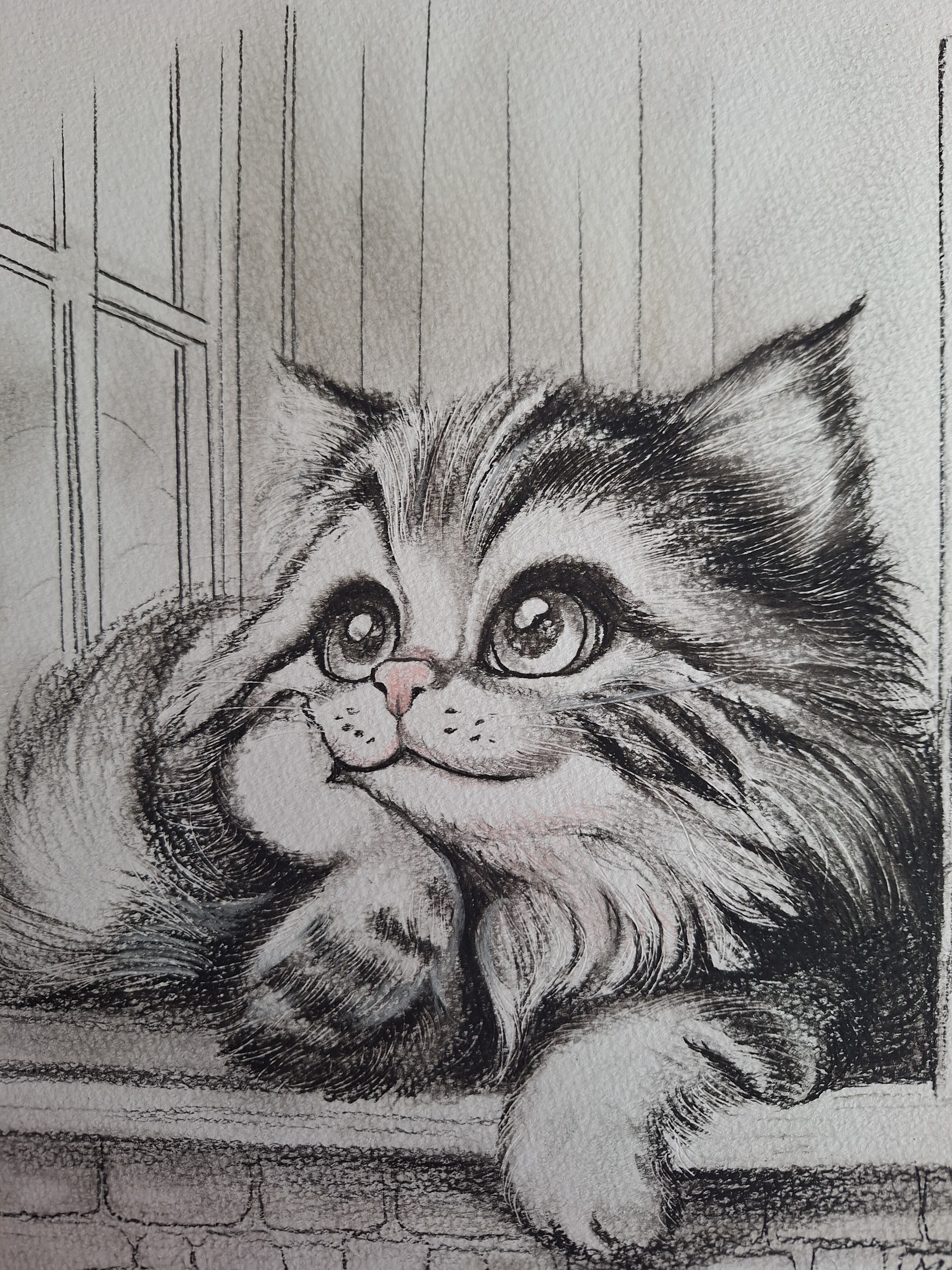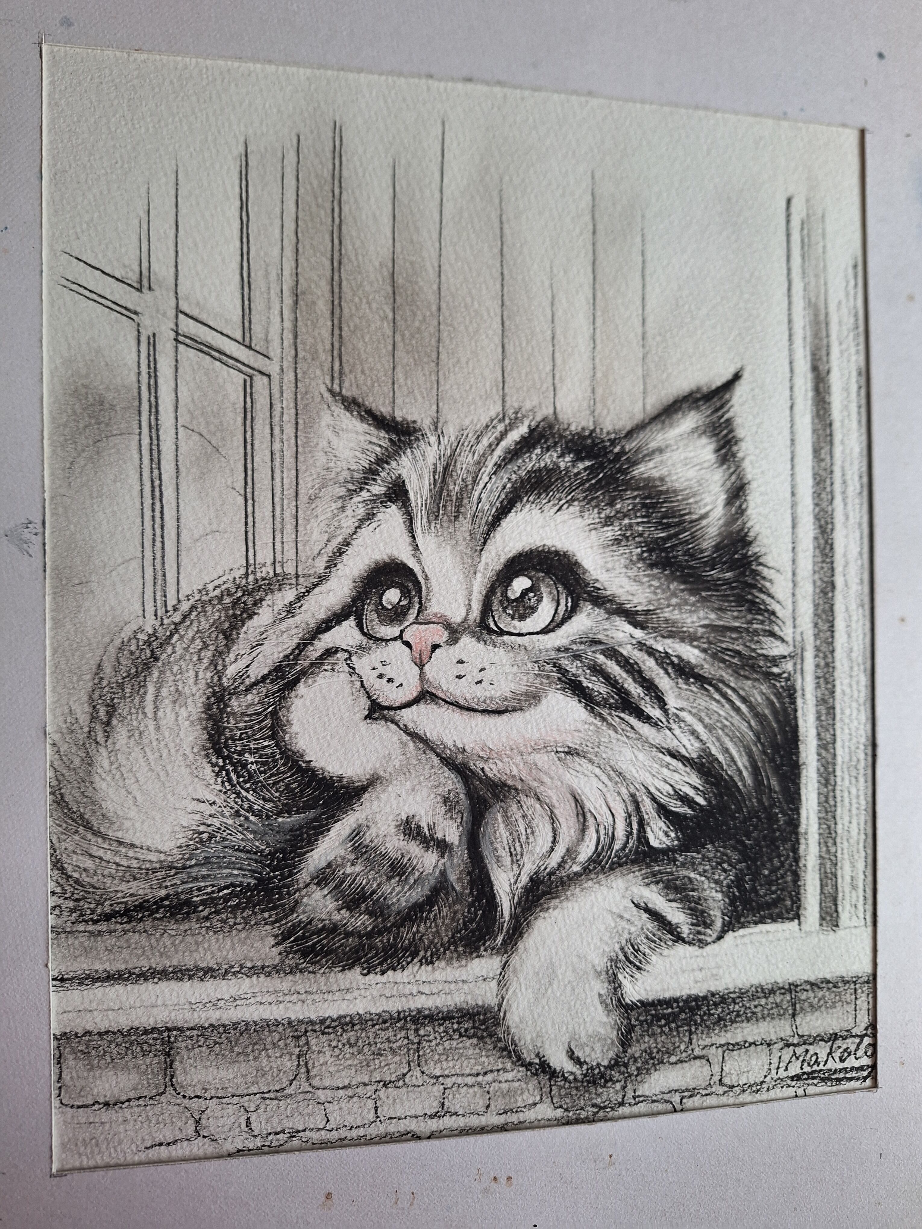 鉛筆画で窓辺で暖かい陽射しを浴び、まったりとしているネコを描きました。