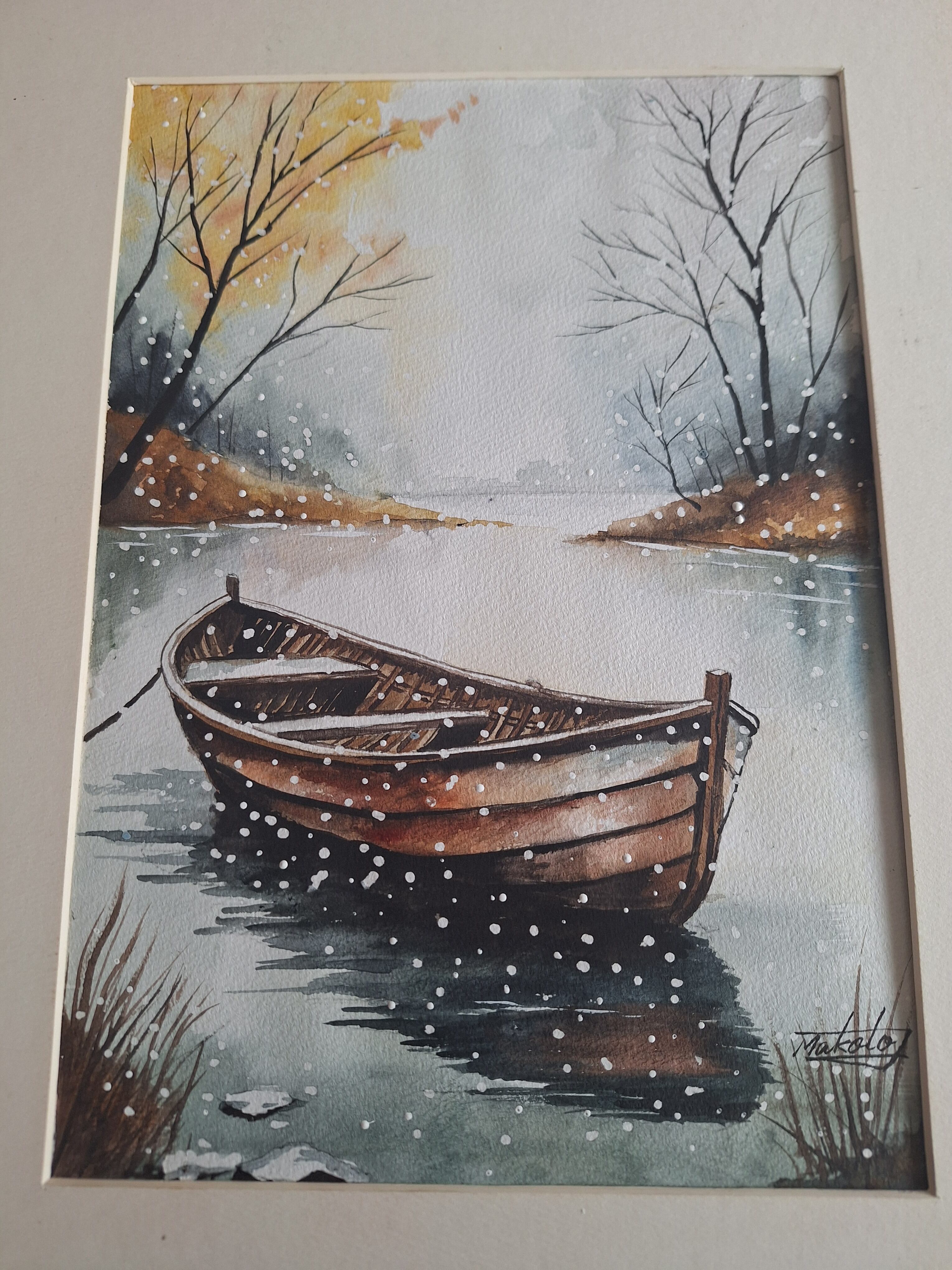雪がしんしんと舞う中、古船が静かに刻の経つのを待っている様子を描きました。