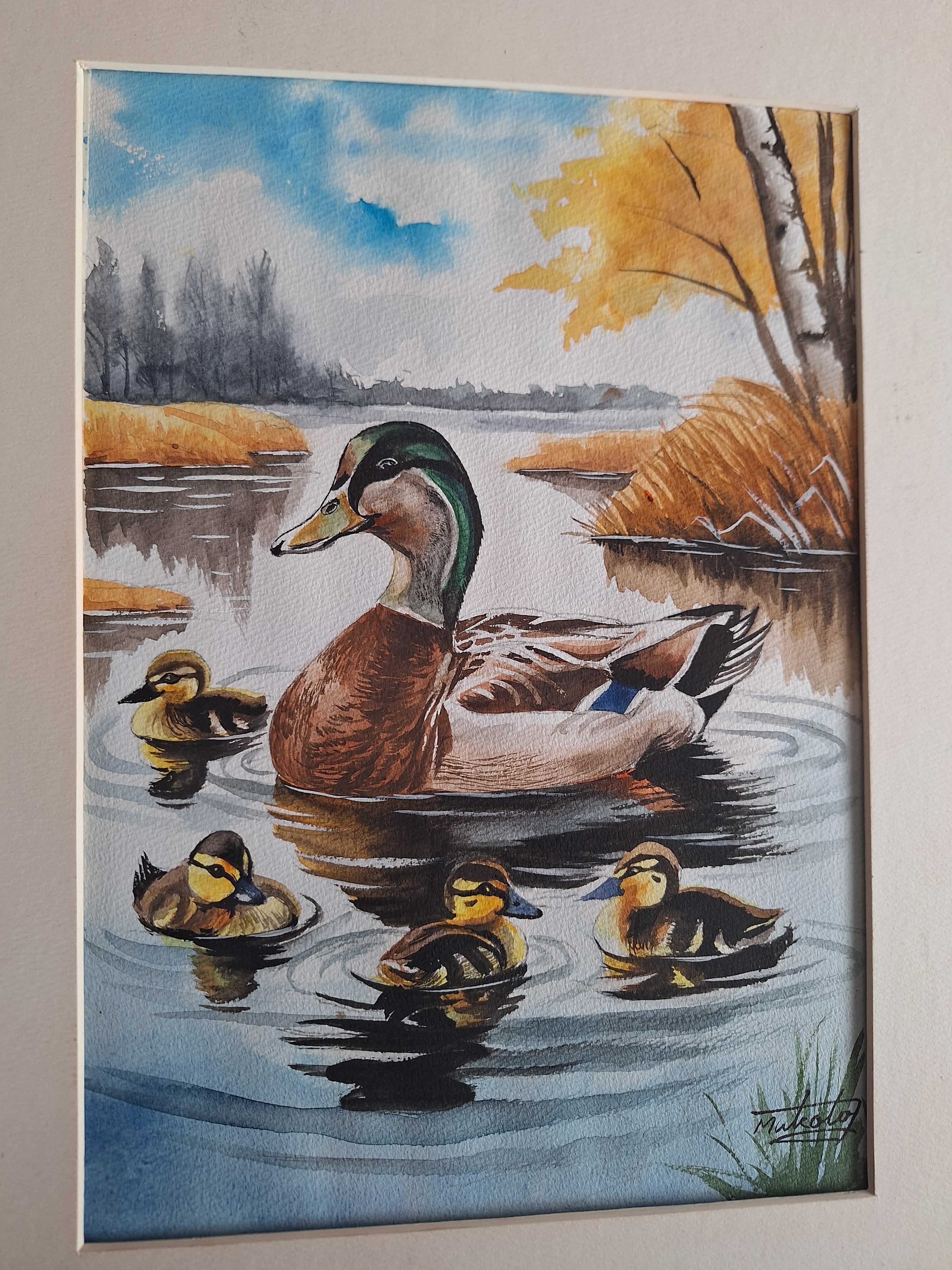 晩秋の時期に川でマガモ母子仲良く、心地よく泳いでいる風景を描きました。