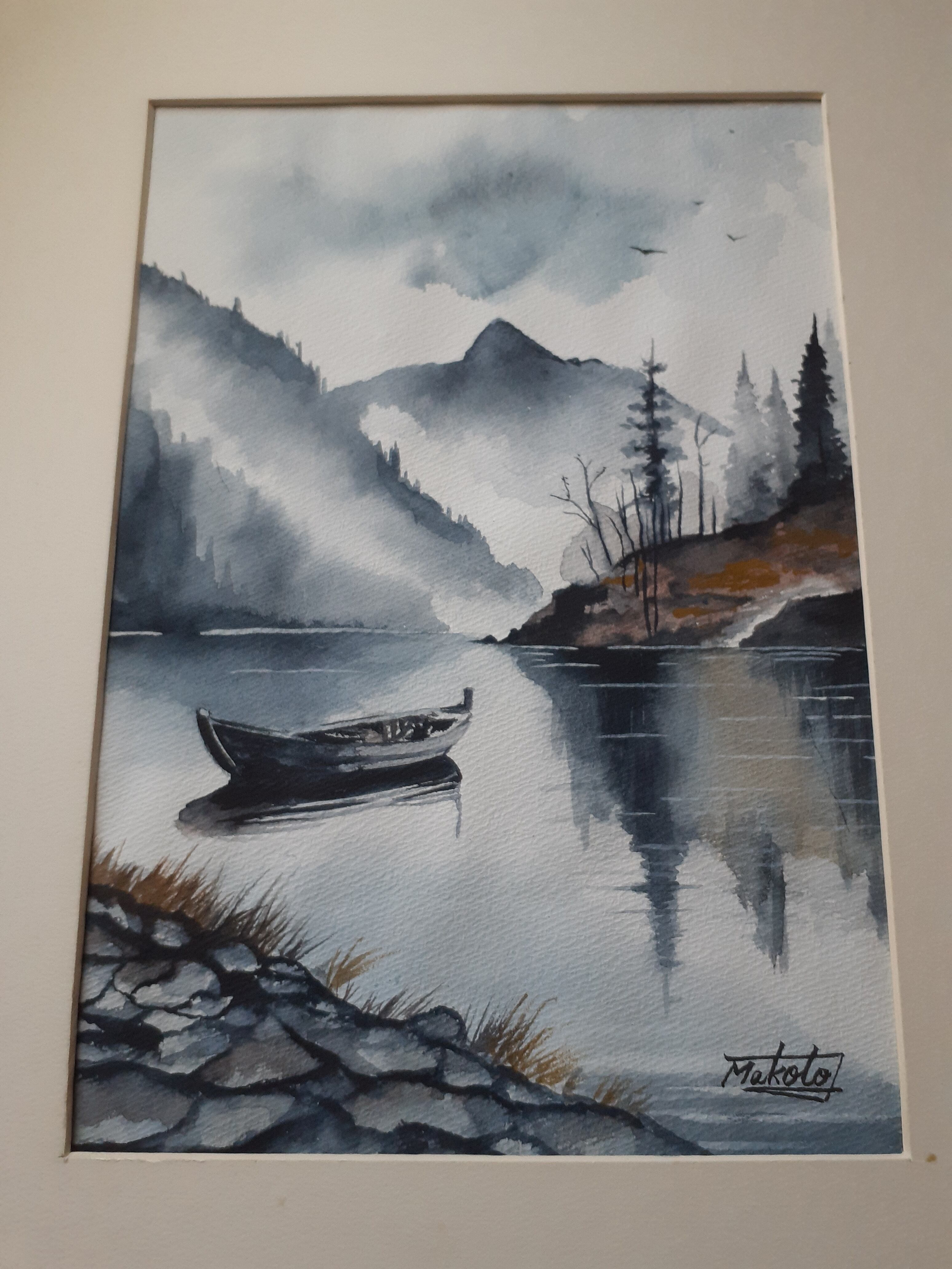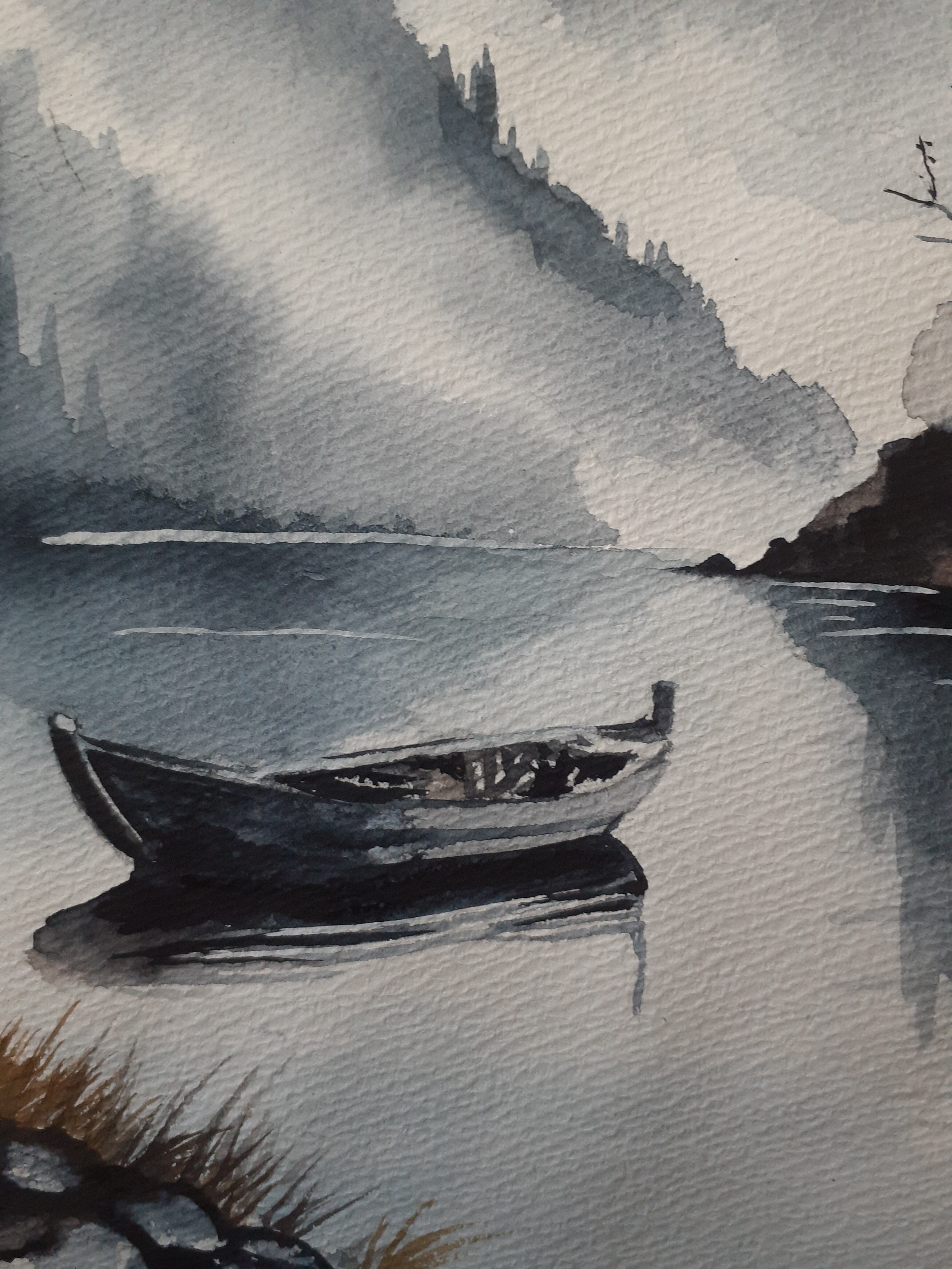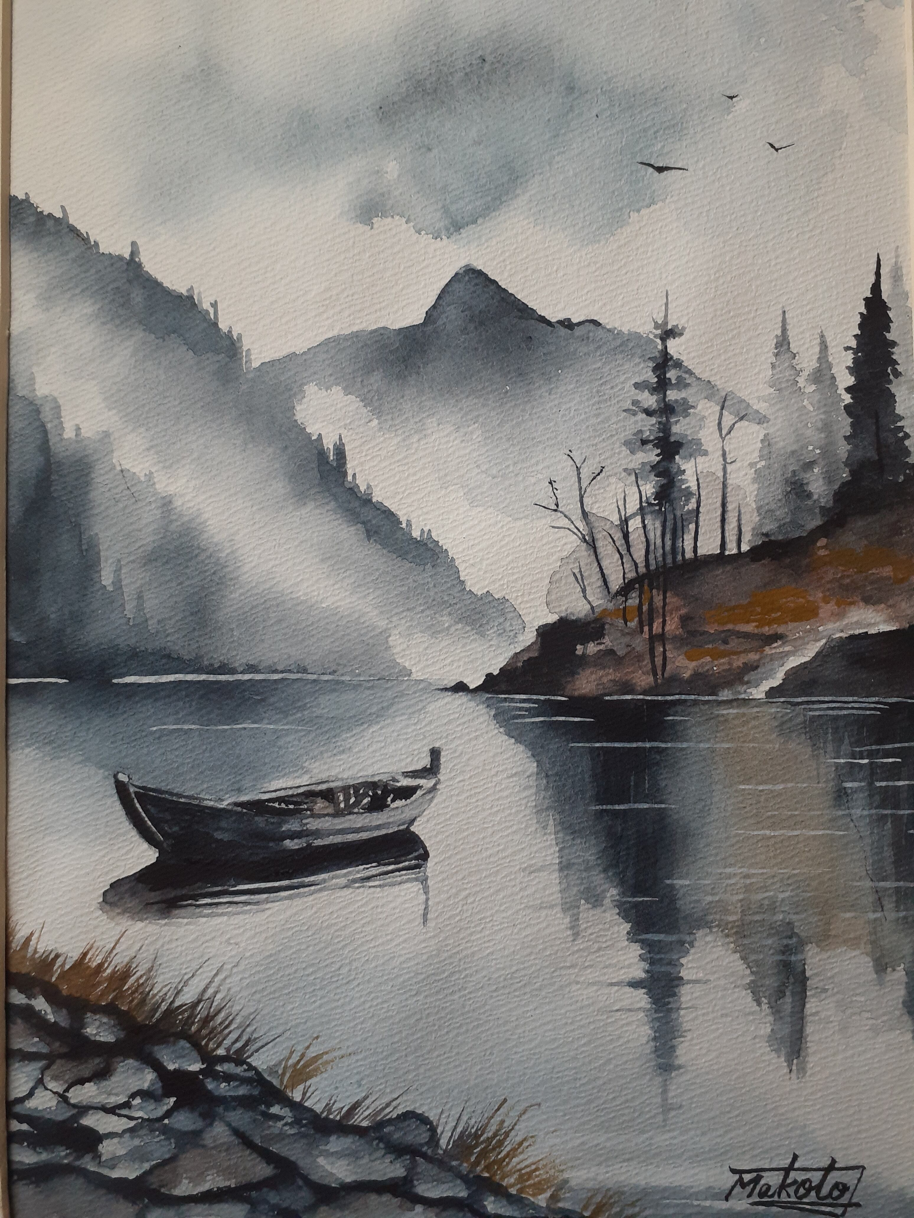 霧のかかった山々の間に佇む古船が静かに刻の刻む風景を描きました。