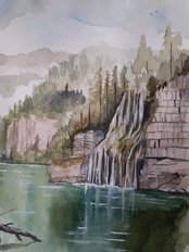 青く澄んだ湖に水がながれおちる滝の風景を描きました。